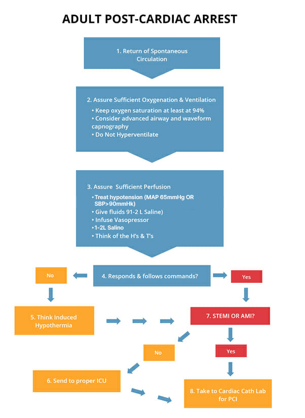 Chapter 10 : Post-Cardiac Arrest CarePost-Cardiac Arrest Care IntroductionIn this chapter, a healthcare personnel can learn that during proper resuscitation there may be return of spontaneous circulation (ROSC) where adequate post-cardiac arrest care is crucial for the survival and good quality of life of the patient. Post Cardiac Arrest Care Video:Algorithm for the post cardiac arrest care: