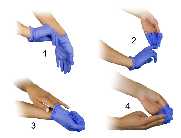 “If you are stuck by a needle or other sharp or get blood or other potentially infectious materials in your eyes, nose, mouth, or on broken skin, immediately flood the exposed area with water and clean any wound with soap and water or a skin disinfectant if available. Report this immediately to your employer and seek immediate medical attention.” – OSHA Removing Gloves Safely:Remember when removing contaminated gloves you will have to do so without touching the outside of the gloves with your bare hands.