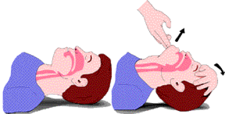 Obstruction of the airway during cardiac arrest is usually due to the relaxation of muscles in the throat causing the tongue to fall back and occlude the airway. The methods to open the airway include: head tilt–chin lift, jaw thrust, mouth-to-mouth ventilation, mouth-to-nose ventilation, mouth-to-barrier device ventilation, and bag-mask ventilation.
