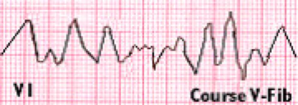 VF does not have an identifiable ECG waveform. Earlier waveforms show a “coarse VF,” but after few minutes the waveforms are much smaller and show a “fine VF.”