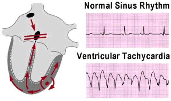 Ventricular tachycardia (V-tach or VT) is a fast heart rhythm from the ventricles of the heart. VT can lead to VF and cause sudden death of the patient. A pulseless VT has no cardiac output causing no pulse and results in cardiac arrest. The causes of pulseless VT are: