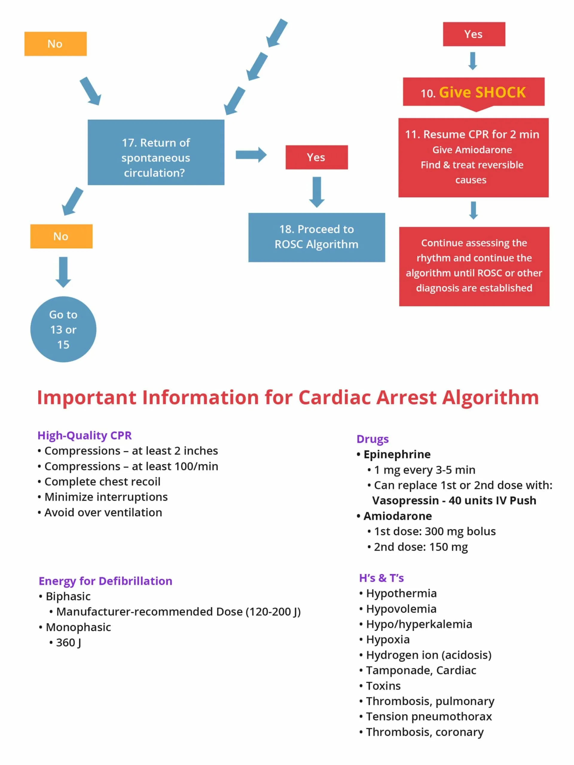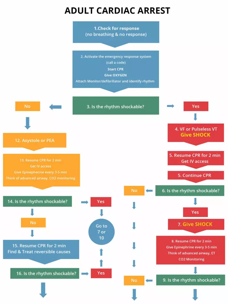 The following is an algorithm shows management of cardiac arrest due to a flat line situation or asystole/PEA (left side of chart)