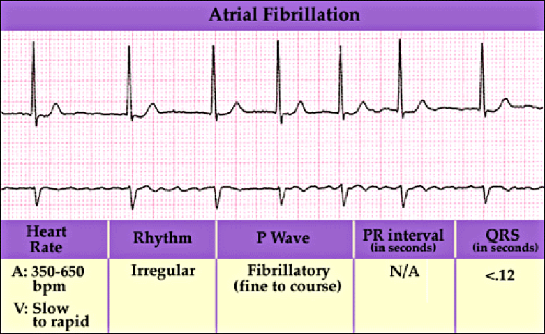 Atrial fibrillation is when the heart beats do not occur at the same intervals. It is known as the quivering of the muscles and involves both the atriums of the heart.