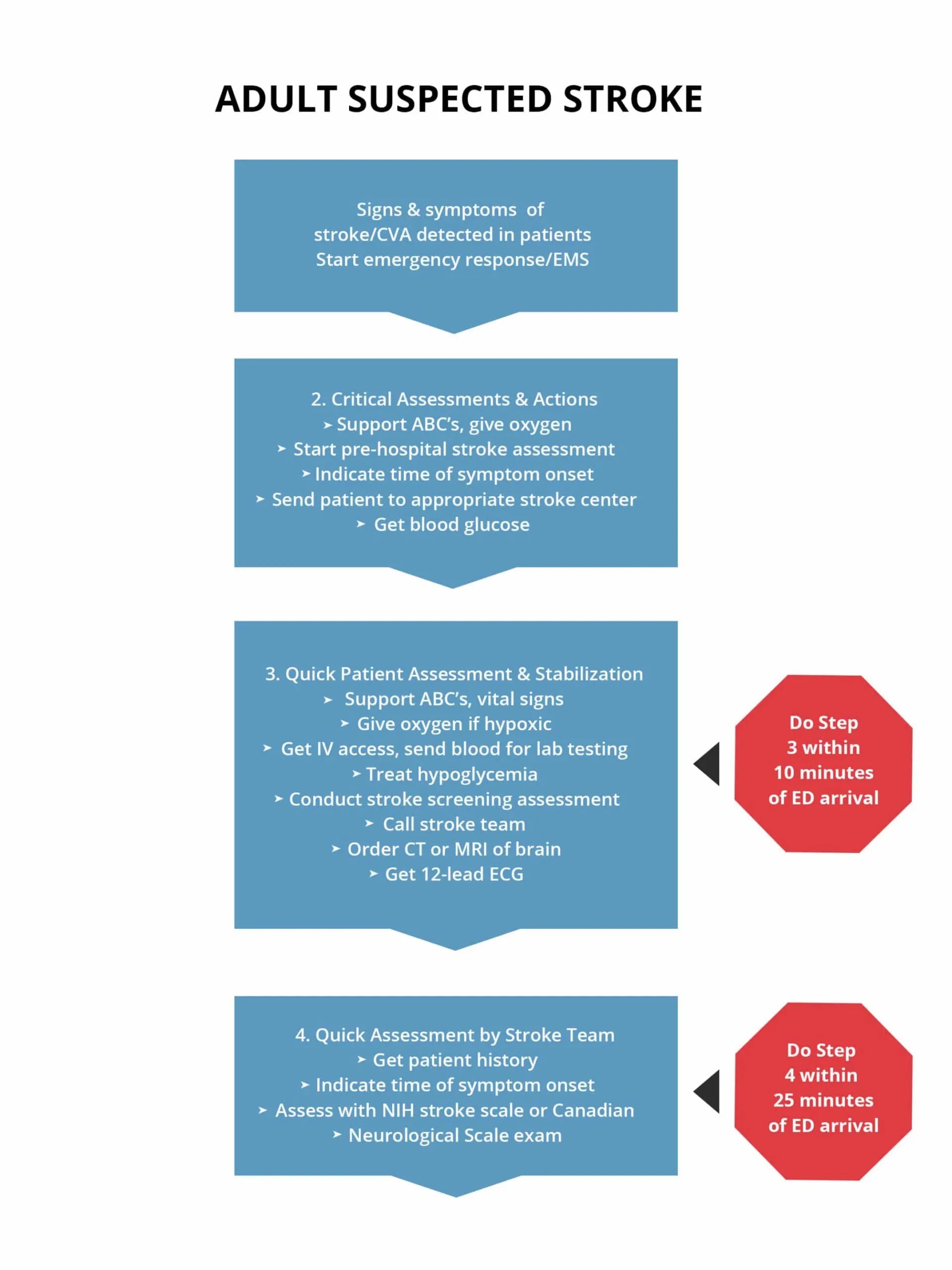 Adequate stroke care involves reducing brain injury and increasing chance of patient’s survival and recovery. According to the American Heart Association there are 8D’s of stroke care which are important in diagnosis and treatment of a stroke.